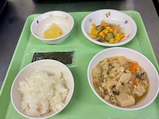 今年全員で食べる最後の給食になりました。 時々給食室のガラス越しに手を振ってくれる子供達に元気を頂いています。 メニューは、豆乳のシチュー、ウインナーソテー、フレンチサラダ、りんごです。