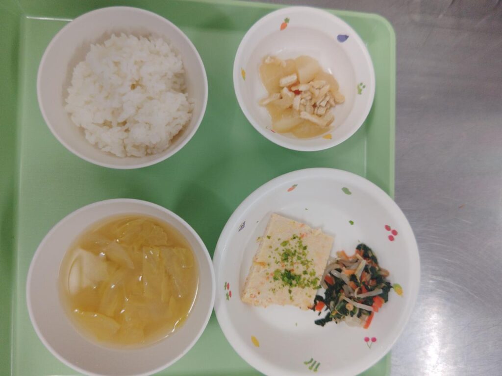 2026.1.31 坂井輪東幼稚園☃️ 新年明けましたが、インフルや風邪が流行している様でお休みしている園児が多いようです。早く良くなってまた、元気な姿が見たいです。 ⭐ある日の献立 ⭐松風焼き・大根煮物・なめたけえ・みそ汁です。 前の記事 お知らせ一覧へ戻る サービス案内 お問い合わせ